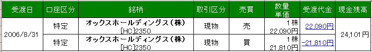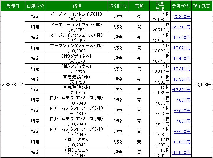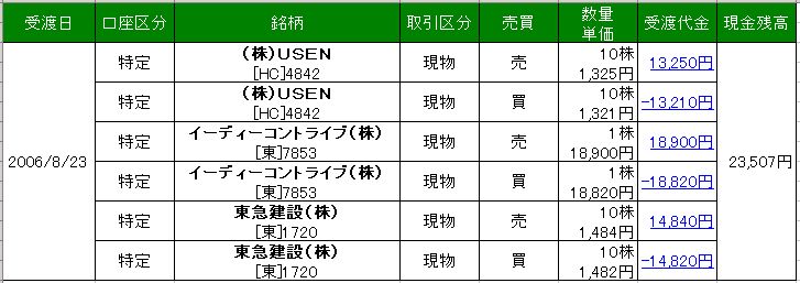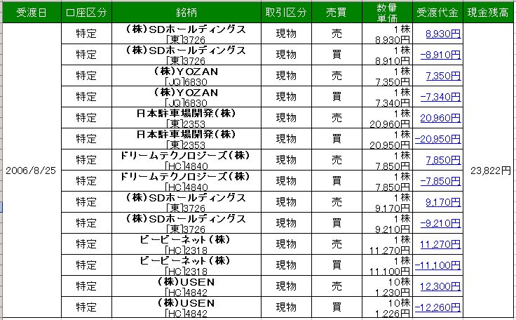 今日も、順調でした。もう少し利益出せたんですが・・・あわてて売ったものがあって、まあしょうがないしょうがない・・・いつものことです。あと、昨日楽天証券で注文していた銘柄が約定せずに相場が終了下と思ったら、後から約定してまして・・・今日は値が下がるんじゃないかと思って、前場から画面を見ていたらなんとか+で売れました。どんどん成り行きで売りが殺到するのでかなり危ない・・・。とっとと売ってしまって少し利益でしました。 後場にもS高で少し上下している銘柄を2つ見つけたので、ちょっとしたで転落してくるのを待ちました、注文の後買えたのはいいですが、直後にがんがん売ってきて、買値-500円というやばいところにいってしまった。いつロスカットするのか考えていたら、徐々に特買いがはいってきて、2度の特買い後は、またS高へいってしまう。売るのが速すぎてもったいなかった。--