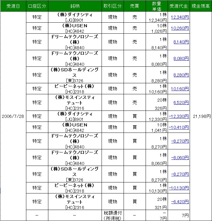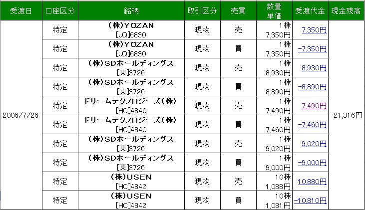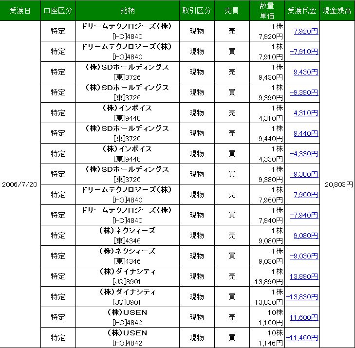 少し、レポートをしながら超ケチケチトレードをしました。松井証券を使ったことがなかったので、どういう使い方かやってみようと思って、とりあえず2万円だけ口座へ振り込み、トレードしました。朝9時からちょっと見ながらやって、ネットストック・ハイスピードでの注文などもやってみました。しかし注文訂正のやり方がやりにくいため、ブラウザで訂正をしてました。まもなく上場廃止のペイントハウスが爆発するかなーって思って、1株ずつ遊んでましたが、ぜんぜん勢いがなかった。結局ペイントハウスは10円の利益、仕方なく、前場の終わりにダイナシティを見たところ、成り行きでの売りが多かったので、その下で1株注文して、約定したので、すぐさま100円くらい上で売りを入れておいたら、やはり成り行きでの大量買いが着てくれたので約定し、結局午前中は100円の利益。少ないなーー。というかボックスレートなので、手数料がかからないのでまあ、OKだった。明日も午前はペイントハウスを見てます。爆発しないかなー。 運がいいのか、今日は無敗でした。損切りなく全部少しの利益確保! 口座残高 20092円 |