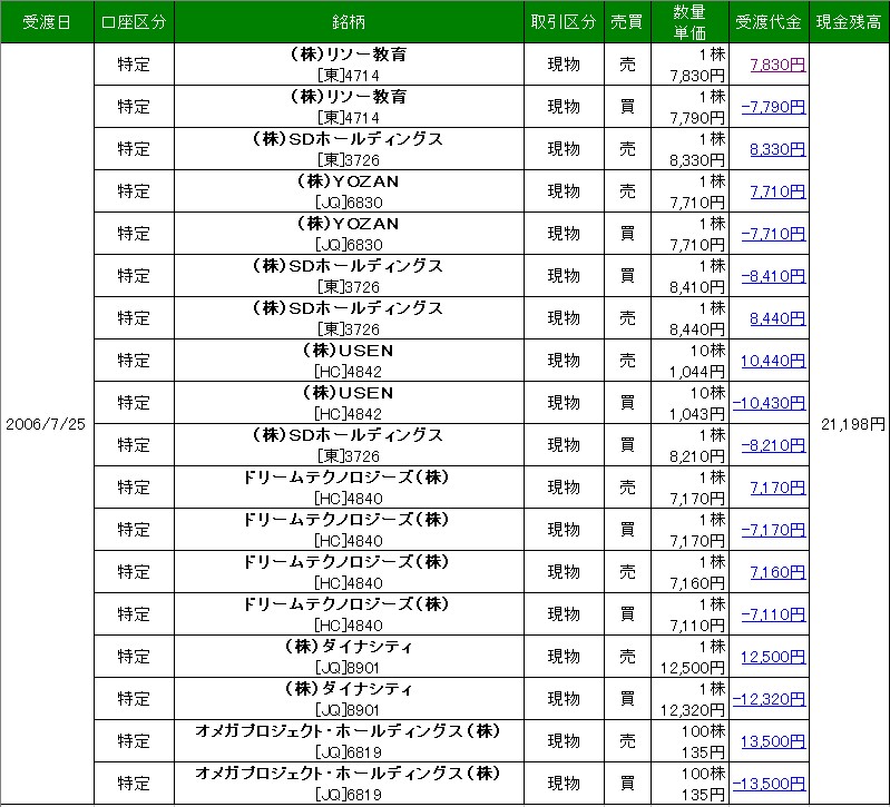 この中から、出来高が多くて値動きが激しいものを選ぶ。またチャートを見て前日の値動きがどのくらいかを調べた方がいい。中にはまったく根が動かない銘柄や、数円の値動きしかしないものが多いので、できれば高値と安値が開いているものを探す。 面倒な場合は、私のような低額トレードをしている人のブログを見てからどのような銘柄を使ってるのか調査することである。 2006.07.14 Fri 21:52:29